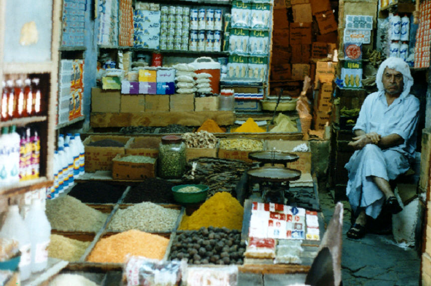 Downtown Manama, the capital (which I keep wanting to call "Manama-na" after the Muppets song), consists of a very modern city, right next to an ancient one. The modern city has hotels, banks, and all the required high-rise office towers. The ancient city is really a giant bazaar, (called here a "souq"). The buildings there look a little older and a little the worse for wear. Extending over many blocks, it is a very large area, where the distinction between "street" and "alley" is, to say the least, a little fuzzy. In some cases, the awnings of the buildings on each side completely cover the passageway, so the distinction between "alley" and "hallway" is a little fuzzy.